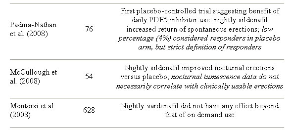 攝護腺癌是男性常見的癌症之一,隨著診斷工具的進步,許多人在早期時便被診斷出攝護腺癌而可及時接受攝護腺根除手術。但是勃起功能障礙常在攝護腺根除手術後伴隨而來,因而嚴重影響病患生活的品質。根據統計,手術後勃起功能障礙的發病率為20-90%。攝護腺根除手術後引起性勃起功能障礙的原因,目前認為可能是因為神經、血管的損傷而造成進入陰莖海綿體平滑肌的血液減少引起缺氧進而形成陰莖海綿體平滑肌纖維化,最後引起勃起功能障礙。解決攝護腺根除手術後勃起功能障礙之陰莖復健的概念最早是在1997年提出,蒙托爾西等人發表了一項隨機試驗,攝護腺癌根治術的男性在使用海綿體內注射12週,每週三次的治療後,在手術後6個月有67%的男性恢復自然勃起並可成功穫得魚水之歡,而對照組僅有20%。從那時開始,陰莖復健的概念開始萌芽,也逐漸有一些研究發表。陰莖復健的定義為使用任何藥物或設備,最大限度地恢復勃起功能。其目的是預防陰莖海綿體平滑肌結構上的改變。第五型磷酸二酯酶抑制劑(PDE5i)是最常用於治療勃起功能障礙的藥物,近來也逐漸有研究探討第五型磷酸二酯酶抑制劑對於陰莖復健的治療效果。 接受攝護腺切除術後的神經傳導途徑受損造成病患沒有自然夜間勃起的反應,使得流入陰莖的血液減少,導致陰莖海綿體細胞凋亡而最後可能造成陰莖組織纖維化而產生勃起功能障礙,早期陰莖復健可以增加流入陰莖的血液,使得陰莖組織可以在神經傳導途徑再生時保留下來,這也就是使用第五型磷酸二酯酶抑制劑在陰莖復健上的理論依據。從基礎醫學調查的證據顯示,使用第五型磷酸二酯酶抑制劑,可改善勃起功能,且有利於陰莖組織的影響。 最近的臨床研究結果顯示,使用第五型磷酸二酯酶抑制劑可做為攝護腺癌根治術後陰莖復健的一種方式,然而對於勃起功能改善的幅度,目前還不清楚(表一)。